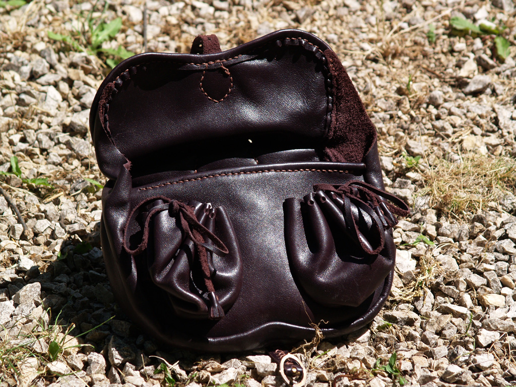 Questo borsello l’ ho realizzato sul modello prestatomi da un buon amico. Purtroppo non sono riuscito a realizzarlo bene quanto lui e si nota soprattutto nelle finuture. Comunque sia è un buon manufatto molto morbido e robusto ottimo per portare quelle suppellettili da avere sempre a portata di mano come l’ acciarino, aghi e filo per cucire, gli occhiali, un fischietto… Nonostante non abbia mai avuto particolare cura di questo oggetto non ha ancora particolari segni di usura.