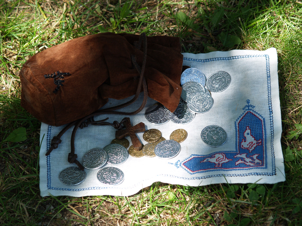 15/06/2006Un piccolo accessorio che sono solito attaccare alle brache. Non sono sicuro della sua storicità in quanto gli ho attaccato un passante che mi sembra comunque credibile. All’ interno ho alcune riproduzioni di monete trecentesche, si tratta di fiorini e grossi. Purtroppo non mi intendo di numismatica quindi non so esattamente il loro valore, ma per certo dovrebbero rappresentare una consistente quantità di denaro.
