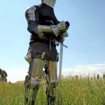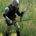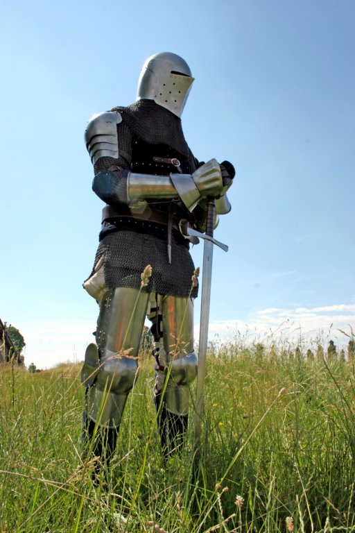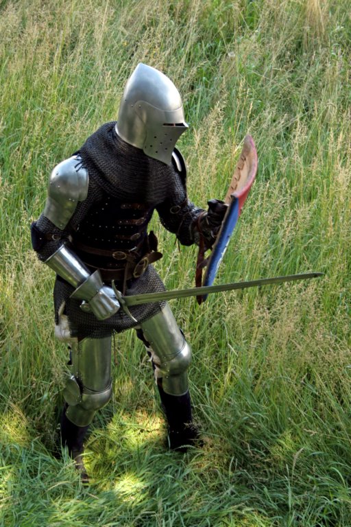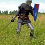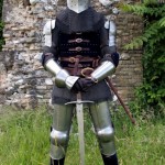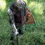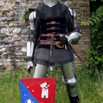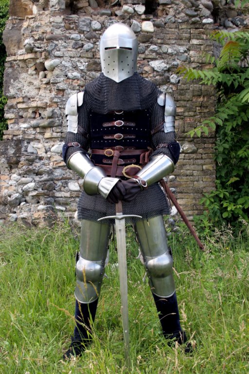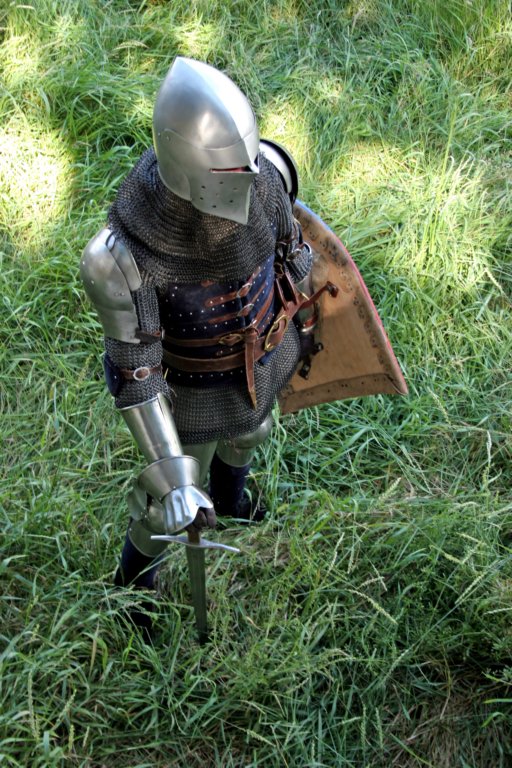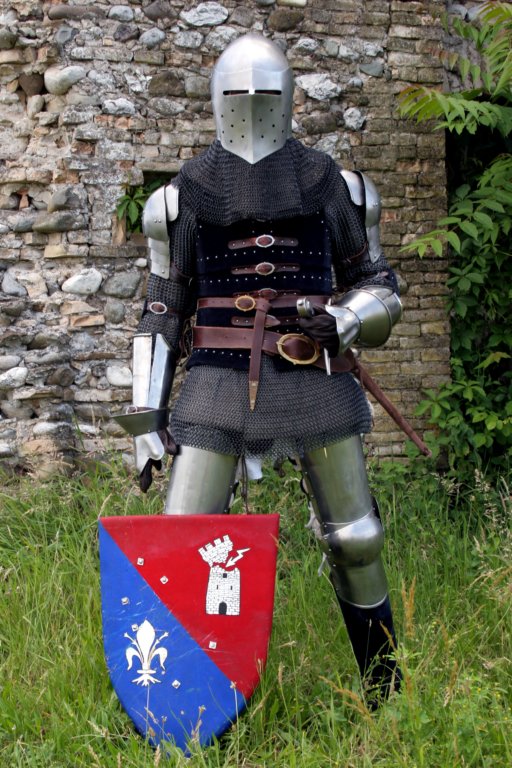 15/08/2006Alcuni scatti per osservare a tutto tondo questa armatura transizionale trecentesca e quanto sia funzionale. Da notare che potrebbe essere definita filo-francese per l’elmo e per il gusto complessivo, la cosa trova piena giustificazione pensando alla grande commistione di professionisti della guerra di tutt’ europa presenti nel trecento in Italia.