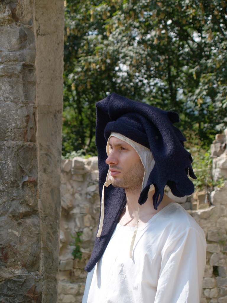 Lo chaperon era un tipo di cappuccio (o Ucco) comune che è esistito in Europa dagli inizi del Medio Evo. Agli inizi fu solo un largo e decorato cappuccio. Includeva una piccola cappa sulle spalle spesso decorata lungo il bordo e una lunga coda. Nel ‘300 qualcuno iniziò a indossare lo chaperon con la testa nell’ apertura normalmente riservata per il volto, avendo il resto del cappuccio penzolante dalla cima della testa. Curiosamente questo diventò il modo più comune di indossare questo copricapo e cominciò ad essere disegnato per questo uso specifico, la coda si allungò e il decoro lungo il bordo divenne sempre più elaborato.