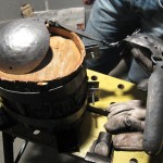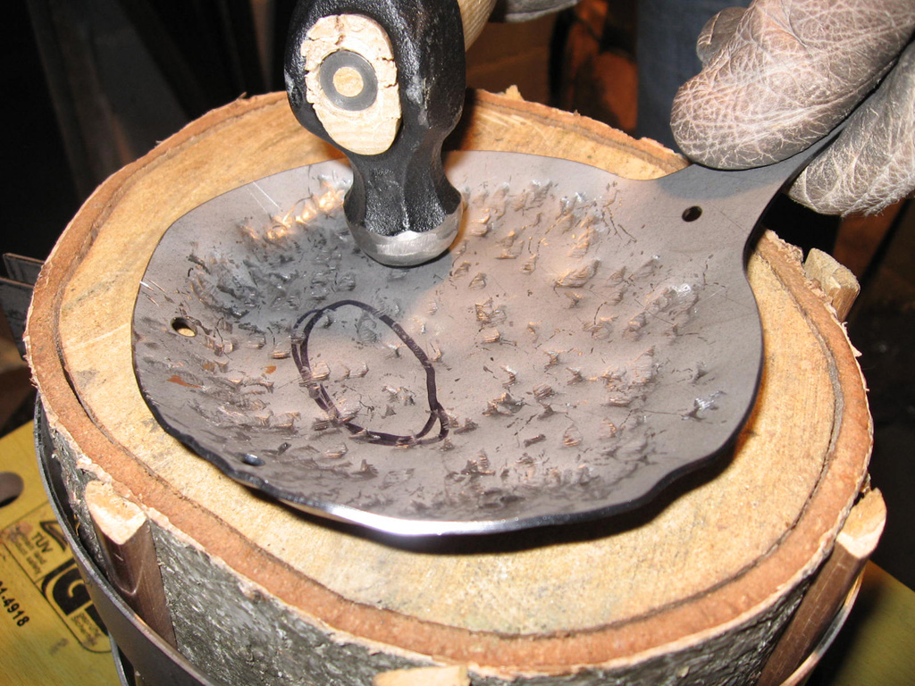 Per realizzarla sono partito con delle speculazioni sulle dimensioni e le forme in piano e ho cercato di dare i volumi ai vari pezzi con un processo di battitura a freddo. I principali utensili usati nella fase di formatura sono stati un martello a testa tonda, un piccolo ceppo di frassino con intagliato una forma a scodella e un profilo ad “U”, dapprima ho cercato di capire sezione per sezione che tipi di curvature erano necessarie e ho usato un pennarello indelebile per tracciare delle linee di riferimento sui pezzi.