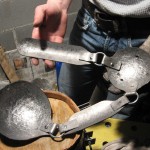 In seguito ho alternato fasi di battitura sul ceppo con fasi di battitura su incudine per uniformare progressivamente la superficie. Finita la fase di formatura per ogni pezzo ho provveduto a realizzare la cerniera dentro cui ho collocato gli anelli che giungono le parti: spalla-braccio-cubito-avanbraccio.
