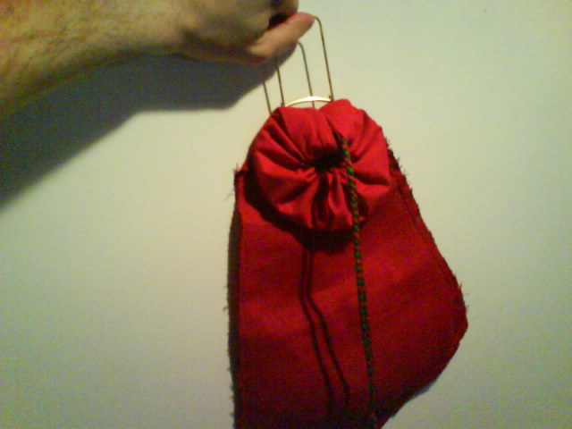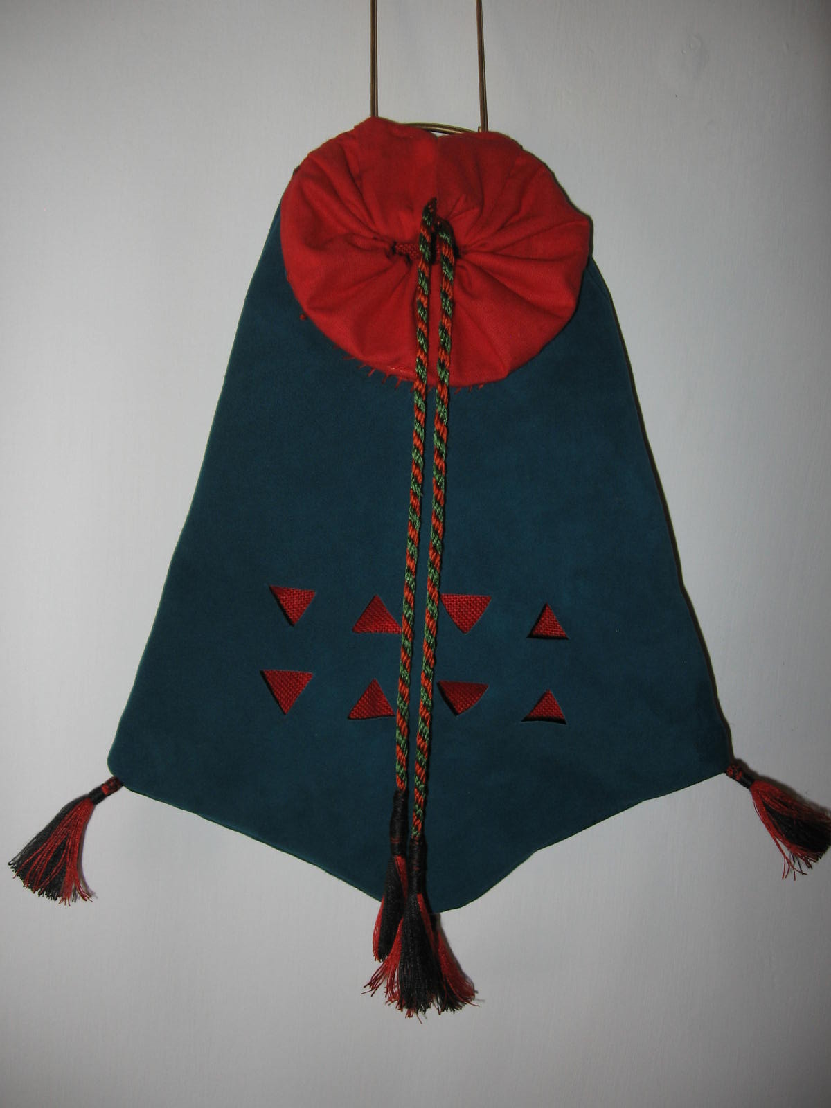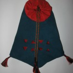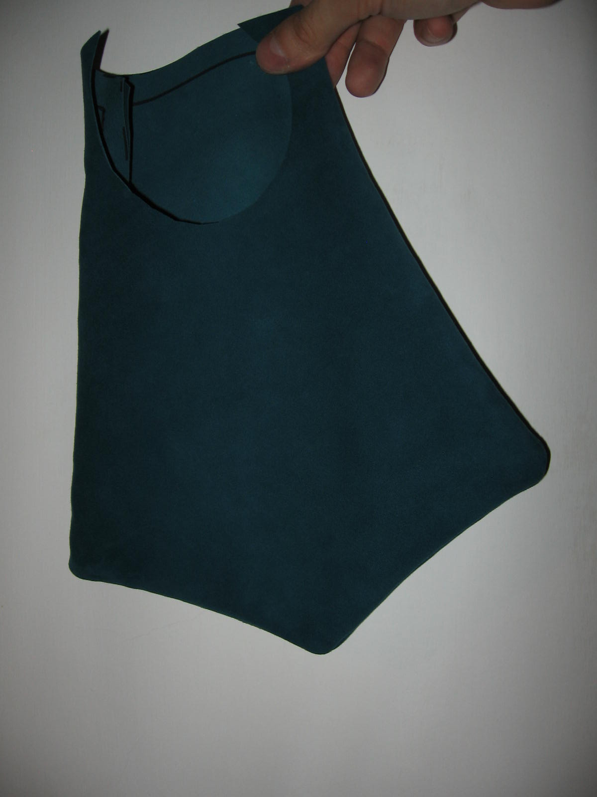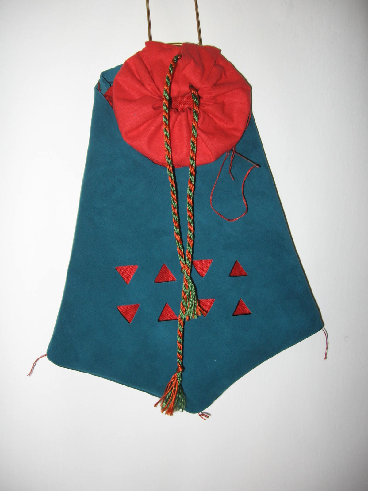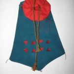 Nota di costruzione: l’interno è in lino rosso, l’inboccatura a strozzo in stoffa rossa, e l’esterno è in cuoio scamosciato colorato di un verde smeraldo. C’è chi dice che queste borse non erano in mai fatte in pelle, ma anzi erano fatte esclusivamente di stoffa il più delle volte ben ricamata, in effetti i reperti tendono a dare ragione a quest’ipotesi e non è detto che in un futuro non mi punga il vezzo di farne una completamente in stoffa, ma ci terrei a sottolineare che la lavorazione del pezzo è basato sul ragionevole dubbio che in fondo se le borse e i borselli venivano prodotti in pelle perché nessuno non ha mai prodotto una tasca con questo stesso materiale?! Io un paio di risposte ce le avrei ma preferirei prima sentire le critiche di qualcun’altro.