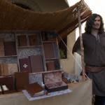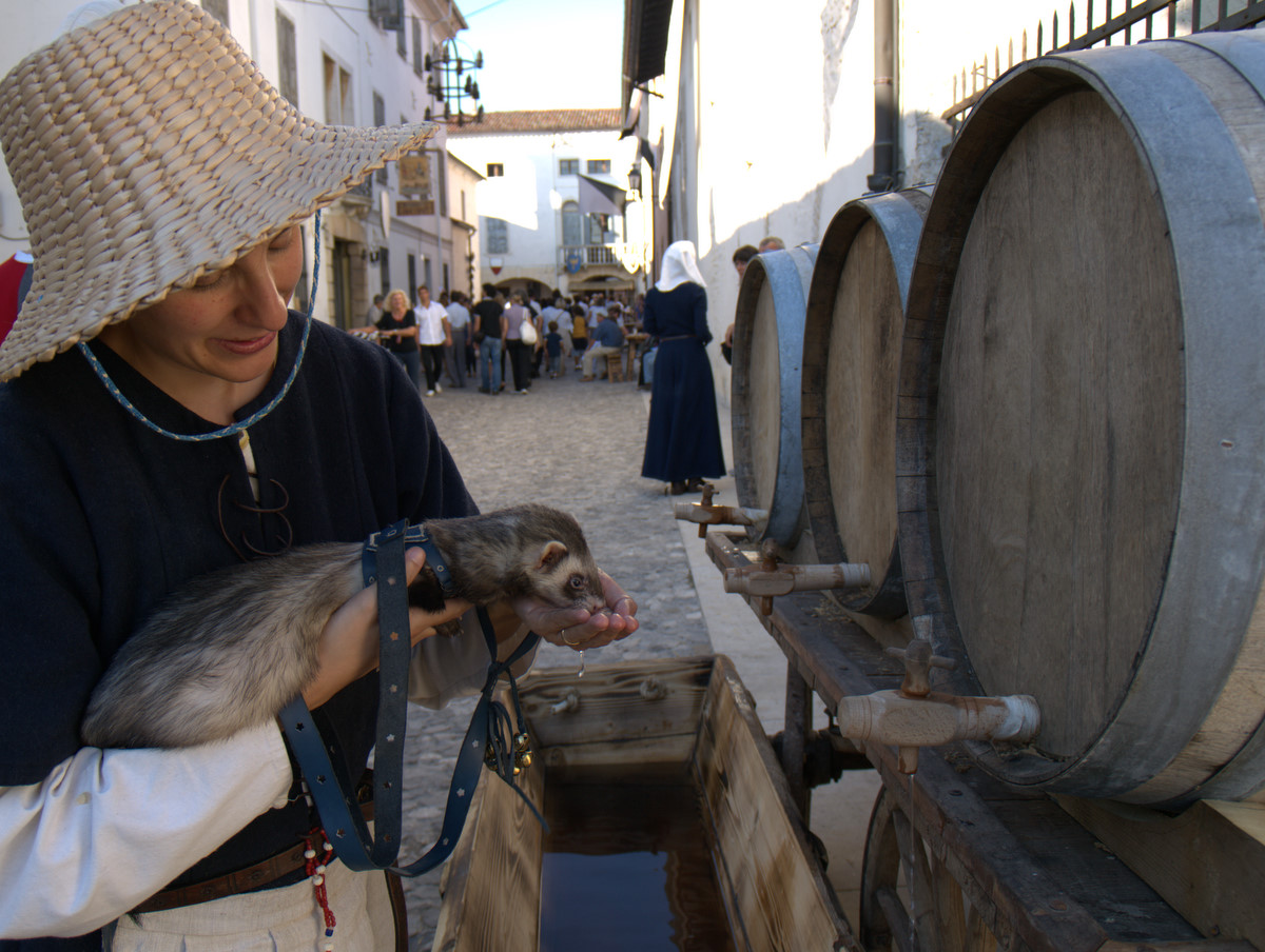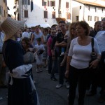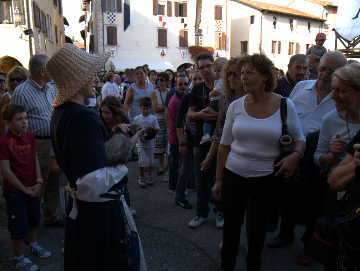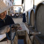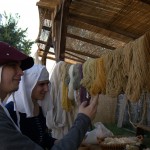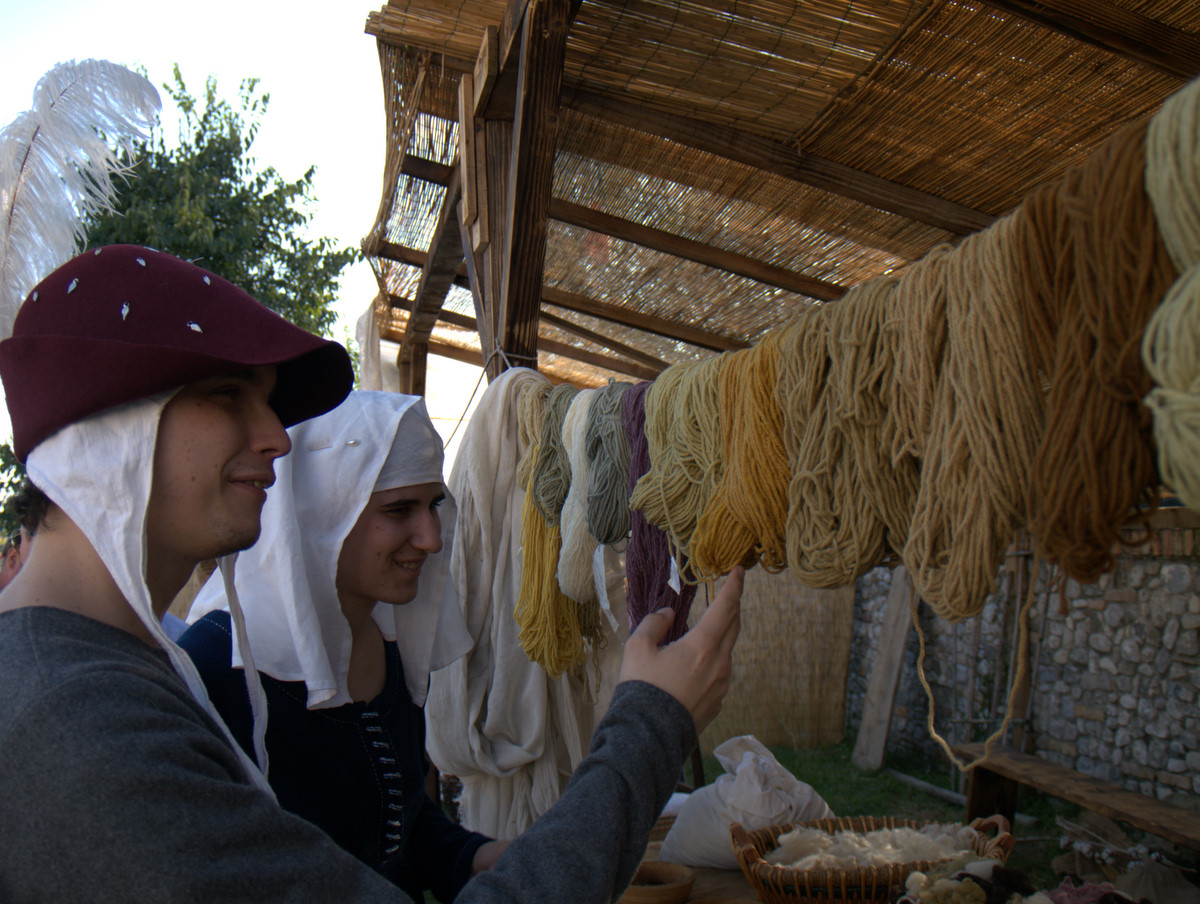 Il nostro piede ha calcato in passato le pietre del centro storico di Valvasone… E durante il weekend, i giorni prescelti per l’annuale rievocazione, l’ha fatto di nuovo: io, Martina, Giorgio ed Alessandra abbiamo infilato il farsetto e il kirtle e abbiamo ammirato le sue strade e le sue attrattive. Molti sono i dettagli che nelle rievocazioni ci fanno storcere il naso (siamo dei perfezionisti!), ma devo dire che l’organizzazione stavolta ci ha a più riprese stupito. Potrete ammirare tra le foto la fantastica impalcatura medievale eretta per il restauro del mosaico posato nel frontone della chiesa; un abbeveratoio di legno con le botti, al quale il furetto Demostene si è rinfrescato; la stupenda bancarella delle lane colorate con metodi antichi ed essenze vegetali (io e Marti facciamo i clienti trecenteschi… Peccato non fossero in vendita ma meramente dimostrative!).