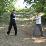 Un’altro esercizio che è stato presentato, a mio avviso fondamentale per capire il Fuhlen (=sentimento del ferro), è stato l’esercizio sul Winden (=torsione della spada per colpire di punta). Tale esercizio viene effettuato grazie alla partecipazione di un compagno che cerca di pungolarti o colpirti a suo piacimento portando a incrociare le spade, starà a chi si allena riuscire a entrare di punta in una delle 4 aperture possibili cercando di ottenere una leva vantaggiosa (possibilmente ottenendo il proprio forte contro il debole avversario insomma).