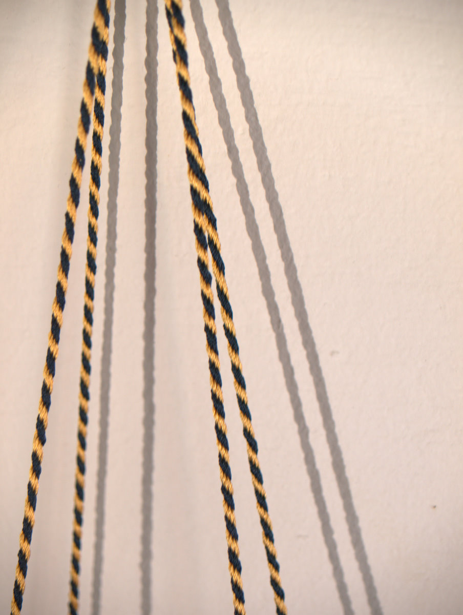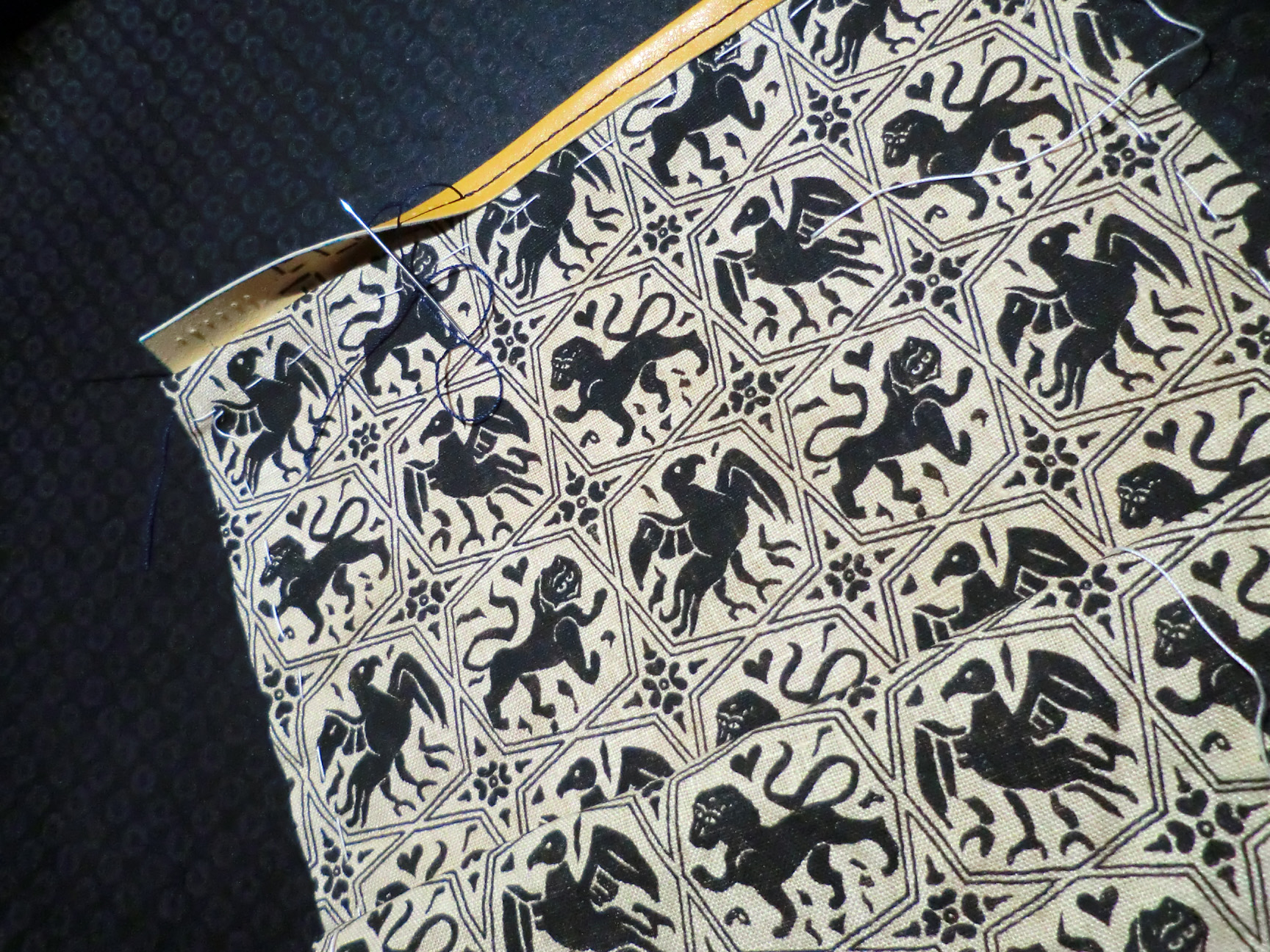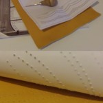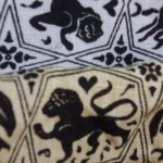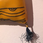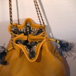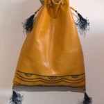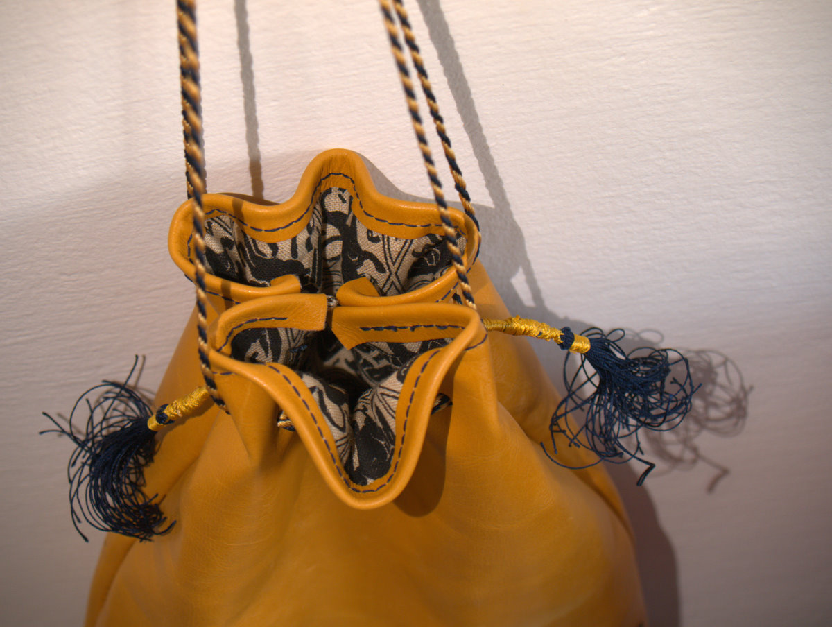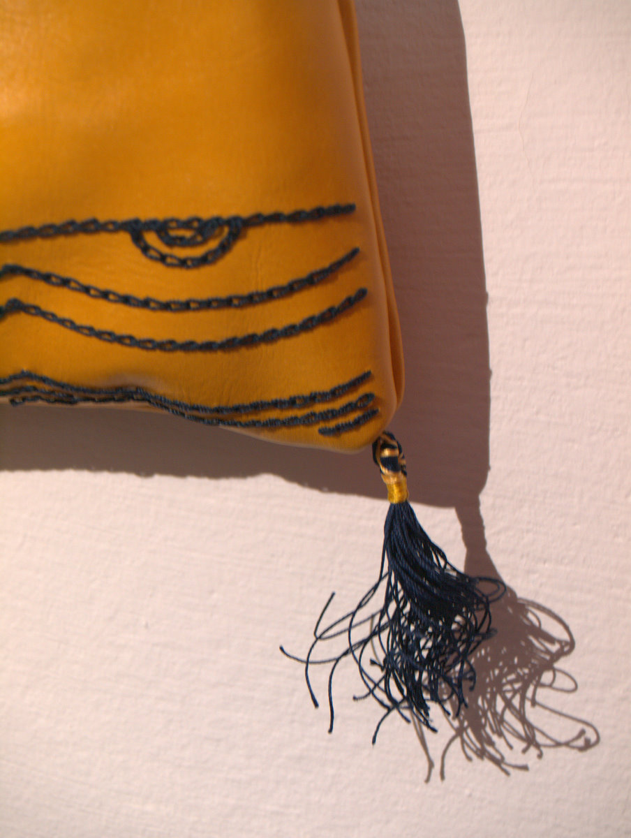 Come potete vedere gli ingredienti sono stati un paio di iconografie che mi hanno suggerito decoro e forma, del filo di seta giallo e blu, una splendida pelle gialla e del lino con stampato il decoro che caratterizza il perpunto di Charles de Blois. Da qui tutto il resto è facilmente intuibile. Unica cosa che non sono riuscito a fotografare è il lungo processo di “finger looping” con il quale ho intrecciato i cordini di seta; spero mi perdonerete ma non avevo letteralmente mani libere per farlo! Il ricamo (eseguito su entrambi i lati del borsello) l’ho realizzato con un punto catenella, mentre i bordi sono tenuti assieme da un robusto punto sella. Ultima lavorazione è stata aggiungere le nappine che mi hanno fatto un pò dannare, purtroppo con il filo di seta bisogna veramente usarne una montagna perché la nappina non risulti rachitica!