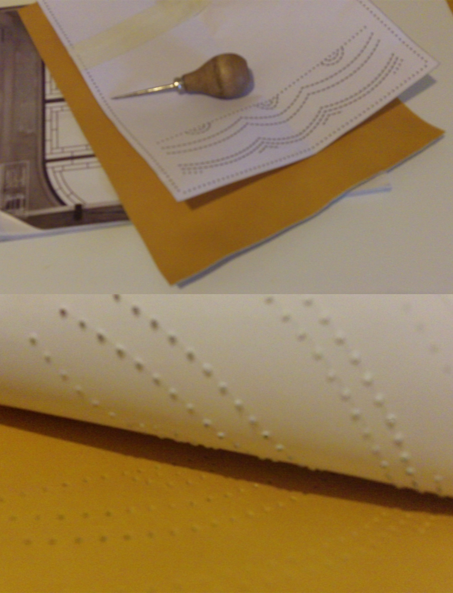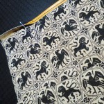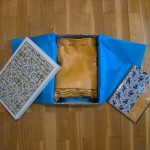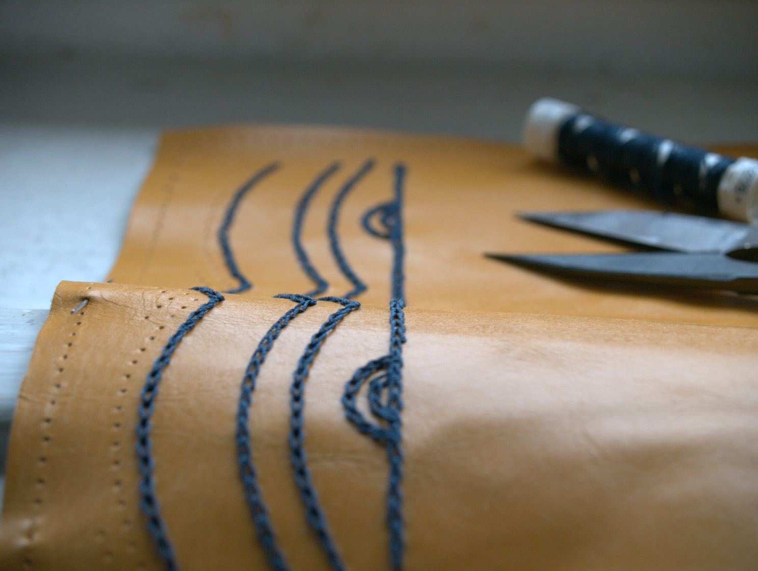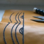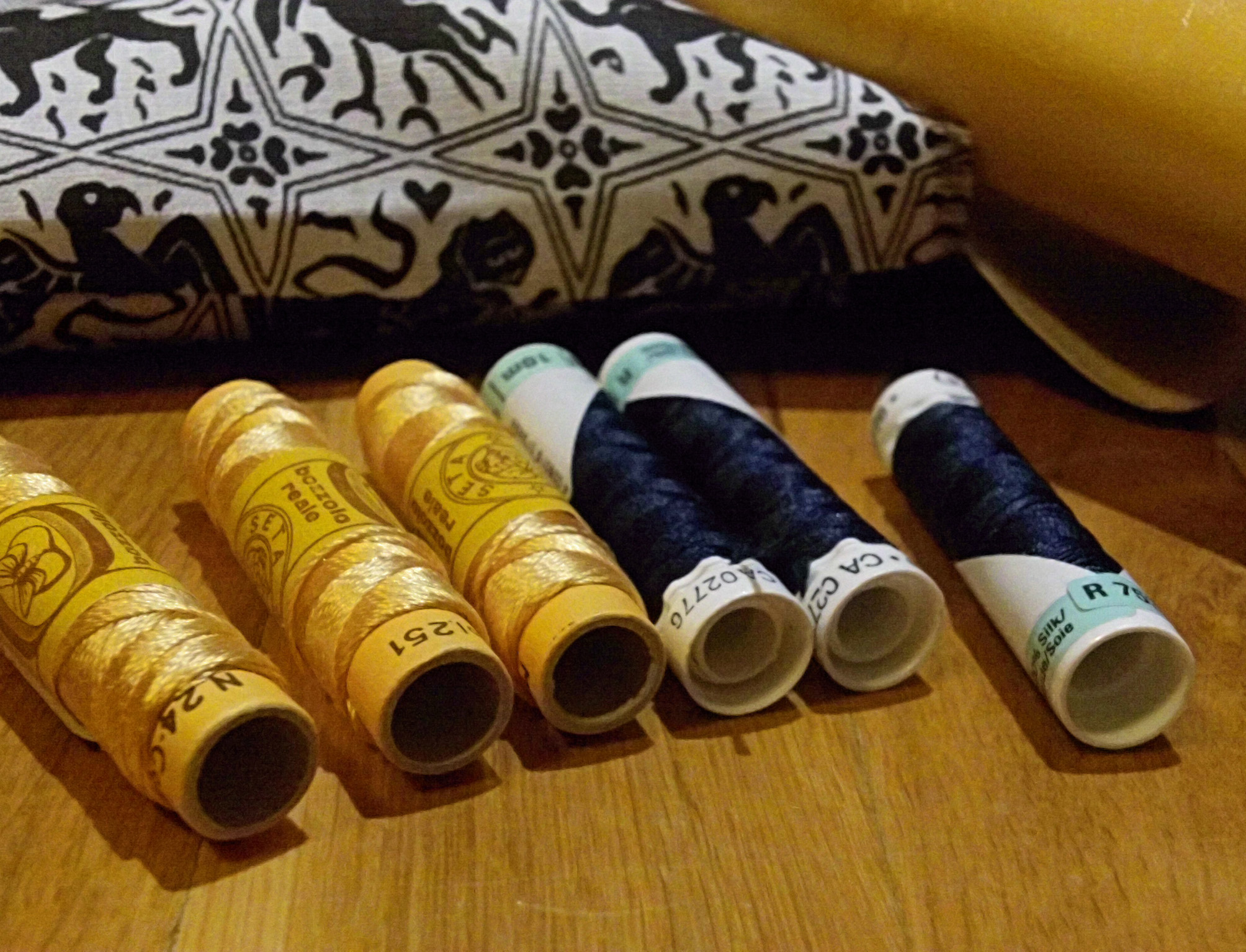 Come potete vedere gli ingredienti sono stati un paio di iconografie che mi hanno suggerito decoro e forma, del filo di seta giallo e blu, una splendida pelle gialla e del lino con stampato il decoro che caratterizza il perpunto di Charles de Blois. Da qui tutto il resto è facilmente intuibile. Unica cosa che non sono riuscito a fotografare è il lungo processo di “finger looping” con il quale ho intrecciato i cordini di seta; spero mi perdonerete ma non avevo letteralmente mani libere per farlo! Il ricamo (eseguito su entrambi i lati del borsello) l’ho realizzato con un punto catenella, mentre i bordi sono tenuti assieme da un robusto punto sella. Ultima lavorazione è stata aggiungere le nappine che mi hanno fatto un pò dannare, purtroppo con il filo di seta bisogna veramente usarne una montagna perché la nappina non risulti rachitica!